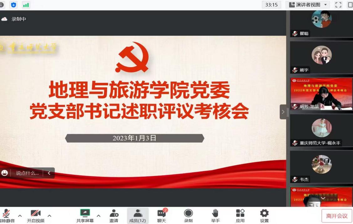 为进一步学习贯彻习近平新时代中国特色社会主义思想和党的二十大精神,推动学院基层党支部建设,发挥基层党支部的战斗堡垒和先锋模范作用,根据《中共重庆市委教育工作委员会关于开展2022年度高校和直属单位党组织书记抓基层党建述职评议考核工作的通知》《中共PA视讯委员会二级党组织党建工作考核办法(试行)》(重师委发〔2018〕68号)等有关要求,我院于1月3日14:30,在腾讯会议线上召开了2022年度支部书记述职考核评议会,党委委员、党建组织员、支部书记参加本次会议,会议由党委书记胡芳主持。