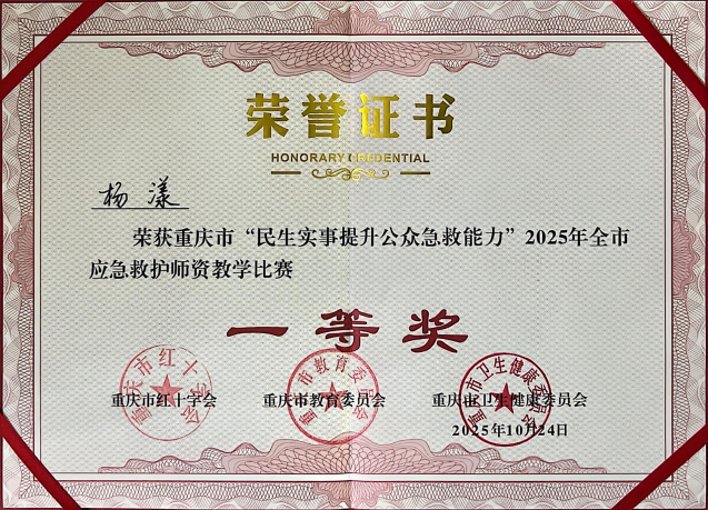 10月24日,由重庆市红十字会、重庆市教育委员会、重庆市卫生健康委员会以及南川区人民政府共同举办的“2025年全市应急救护师资教学比赛”在南川区举行,PA视讯航空服务艺术与管理专业杨漾老师在比赛中夺冠,获得一等奖。