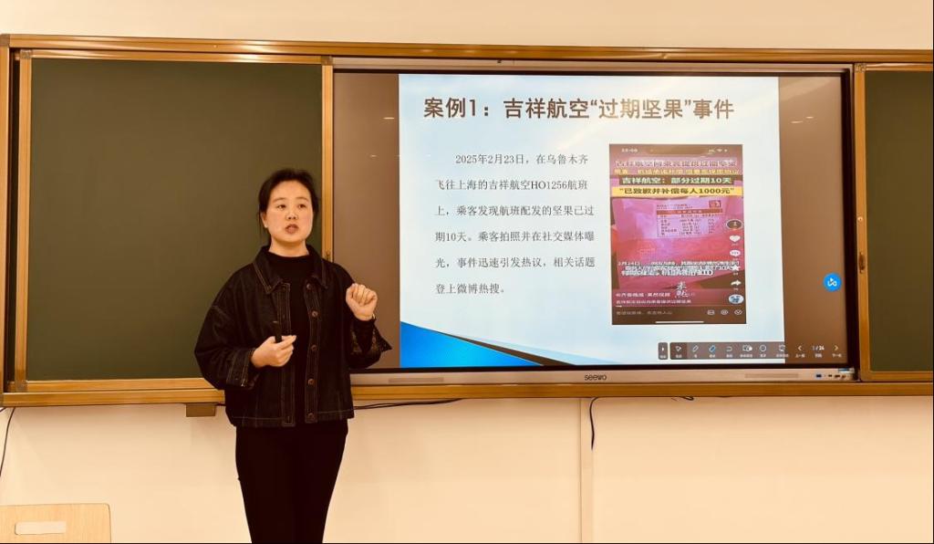校方教师张科则围绕《公共关系危机管理》这一核心,运用案例解剖-理论建构-场景迁移的三阶教学法展开教学。她以吉祥航空“过期坚果事件”为典型案例,通过梳理事件时间轴、分析舆情走向、考量利益相关者反馈等多个维度,深入拆解了危机从萌芽到发酵的全过程,并组织学生进行危机公关的模拟思考。随后,她还引入“机上卫生间教育争议”“校园鸭脖事件”等热点案例,引导学生将所学知识延伸至航空服务、校园管理、新媒体运营等多个场景,通过换位思考的方式,强化学生的跨场景应变能力。
