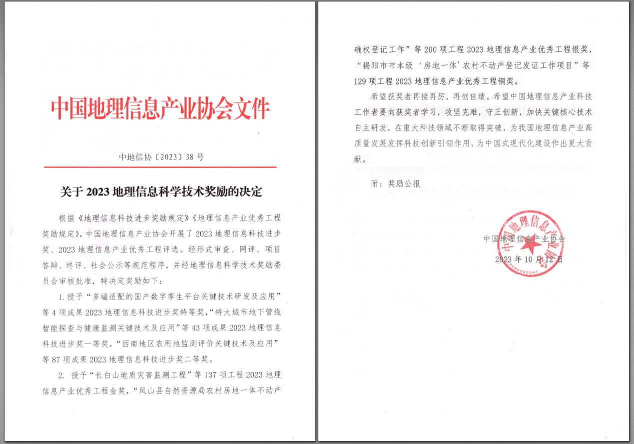 据悉,地理信息科技进步奖是由中国地理信息产业协会主办,根据《地理信息科技进步奖励规定》《地理信息产业优秀工程奖励规定》,旨在表彰在地理信息领域取得突出成就的个人和团队,经形式审查、网评、项目答辩、终评、社会公示等规范程序,并经地理信息科学技术奖励委员会审核批准,授予"多端适配的国产数字孪生平台关键技术研发及应用"等4项成果2023地理信息科技进步奖特等奖,"特大城市地下管线智能探查与健康监测关键技术及应用"等43项成果2023地理信息科技进步奖一等奖,"西南地区农用地监测评价关键技术及应用"等87项成果2023地理信息科技进步奖二等奖。