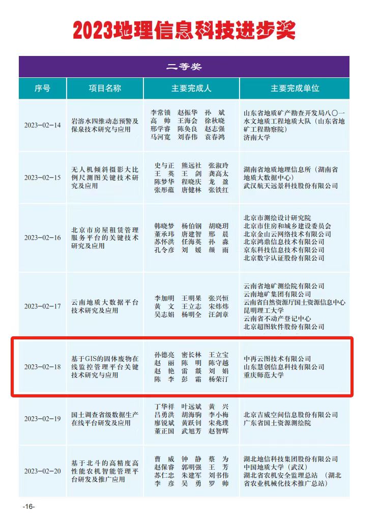近日,2023年地理信息科技进步奖获奖名单正式公示。我院孙德亮主持的“基于GIS的固体废物在线监控管理平台关键技术研究与应用”项目获科技进步二等奖。该成果在深入挖掘固废、危废、医废管理业务的基础上,针对企业废弃物产、收、储、运、处等重要环节,通过引入先进的机器学习和深度学习算法技术,实现企、货、人、车一体化全流程监管、智能化追溯、联动执法控管,切实保障城市生态环境安全。该成果提高了地理信息数据的准确性和可靠性,同时提升了地理信息的获取和分析效率,为社会经济发展提供了强有力的支持,在国土资源管理、环境监测、城市规划、智慧城市等领域具有广泛的应用前景。