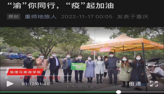 5.加强正面宣传,增强抗疫信心。学院党委及时组织“地旅蓝”志愿者力量,赶写脚本录制《“渝”你同行,“疫”起加油》视频,时长1分40秒,既为全院学生在疫情下的生活加油助力,更着眼于引导学生走出自我封闭的小圈子,打开眼界关注重庆整体疫情形势,增强社会责任感,从遵章守纪做起,努力学习,奋发有为,成长为对社会有用的人才。学院党政领导、学工队伍、学生党员代表出镜录制,内容振奋人心,凝聚众力,起到了良好的舆论正面引导作用。