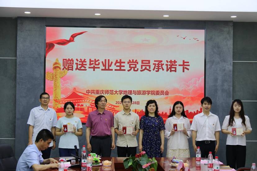 大会第三项,学院党委委员为毕业生党员赠送党员承诺卡。一张张红色的党员承诺卡由教师党员传递给毕业生党员,其间所连接的,既是师生之间的传承,也是党员之间的约定。承诺是为人民的承诺,约定是为国家的约定。