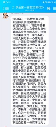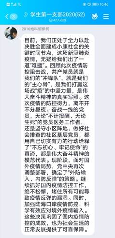 本次党组织生活会围绕“迎党的生日、讲战疫故事、悟初心使命”主题展开,支部每名成员说身边故事、讲切身体会,勉励毕业生党员牢记使命担当,把不忘初心、牢记使命作为终身课题。首先,瞿书记对我院2016级地理信息科学专业张川伟、2016级旅游管理(职教师资)专业张宣友两名同学在疫情期间在重庆机场担任40天志愿者、接待外宾的工作给予了肯定,高度评价了我院多位同学在战疫中无私奉献、敢于担当的突出表现,同时号召一支部全体学生党员向他们学习。接下来,邹梦芸同志分享了她在疫情期间在高速路口为期八天的志愿者工作心得,赞扬了医护人员不畏艰辛、积极奉献的精神;张璐同志分享了身边的党员案例,小区门禁因人手不足,党员带着几岁的孩童上岗工作,这种无私奉献的精神值得所有党员同志学习;马君草同志分享了对钟南山院士先进事迹的感悟,号召党员同志学习钟南山院士“说实话,办实事”的精神;许晓同志通过中外现状对比,看到了祖国的强大,国家能够保障人民生活;熊瑜丽同志对身边在医院工作的亲人的工作历程进行分享,先进事迹来自于生活点滴;任杰同志分享了人民对于疫情期间防控的积极配合,展现了人民在面对危机的团结与努力。学生第一党支部的其他线上党员都通过网络发表了自己的心得体会以及疫情期间的身边先进事迹、先进榜样。