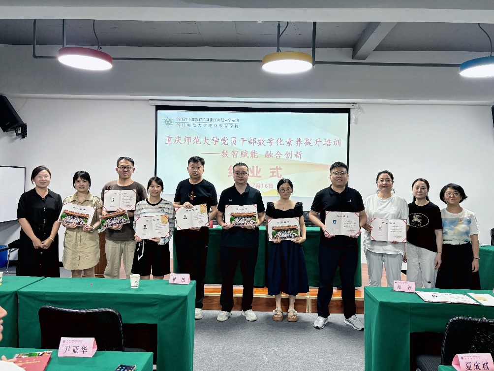 最后,PA视讯胡芳书记、经济与管理学院钟敏书记和浙江师范大学终身教育学院杭州培训中心俞冰主任共同为全体学员颁发结业证书并合影留念。在热烈掌声中,结业仪式圆满结束。