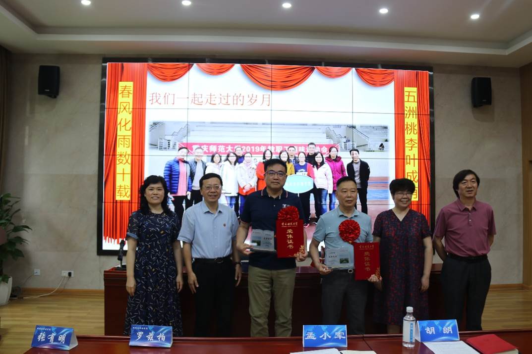 孟小军副校长、胡朗部长为两位老师佩戴大红花、颁发荣休证书及纪念品。