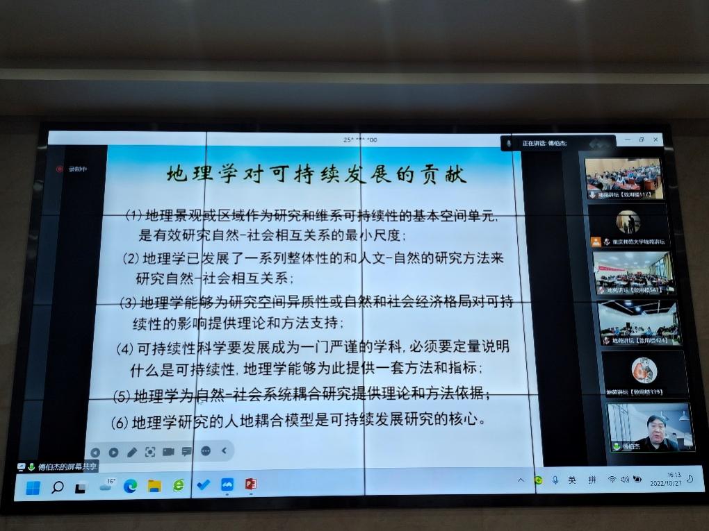 2022年10月27日下午,PA视讯地苑讲坛第二讲在致用楼117举行。中国科学院院士傅伯杰研究员为我校师生作了题为“地理学与可持续发展”的报告。讲坛线上线下同步进行,线上采用微信视频号直播方式,听众超过1700人次;PA视讯全体教职工、部分学生及2022年高中市级骨干教师(地理)培养对象共计200余人分别在线下三个会场参加。讲坛由PA视讯副院长(主持工作)韦杰教授主持。
