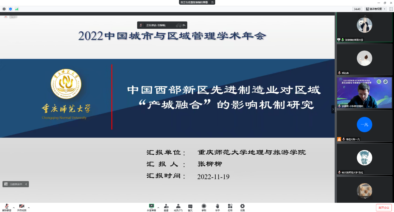 我院刘睿教授指导的硕士研究生张柳柳在“新发展格局下的城市与区域创新”分会场线上作了题为“中国西部新区先进制造业对区域‘产城融合’的影响机制研究”报告。报告以两江新区为例,定量、微观分析了先进制造业的空间布局特征、测度了区域“产城融合”水平,并深入研究了两者的空间关系和尺度效应,以期为区域高质量发展和公共设施合理配置提供科学参考。中国科学院地理科学与资源研究所余建辉副研究员对该报告进行了深入点评和肯定,并提出未来研究建议。
