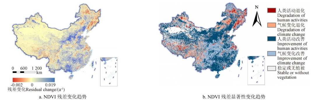 研究结果表明:中国的植被变化在空间上具有明显的区域特征,呈现出自东南向西北递减的趋势;干旱导致新疆准噶尔盆地和内蒙古中部等干旱区植被退化,而温度和辐射增加是促进东部沿海平原、黄土高原南部、四川盆地和云贵高原西南部等地区植被改善的主要原因。21世纪以来人类活动逐渐加强,包括黄土高原水土保持和退耕还林工程、阿拉善荒漠治理、沿海城市群和东北工业基地的建设等。具体表现为内蒙古阿拉善高原、黄土高原中西部和北部以及华南大部分地区植被改善,东北大、小兴安岭、长白山东部和长江三角洲地区植被退化。该研究对植被变化及其驱动因素的研究,可识别植被退化区,为将来生态修复工程的实施和生态文明建设提供理论依据,助力区域绿色可持续发展。