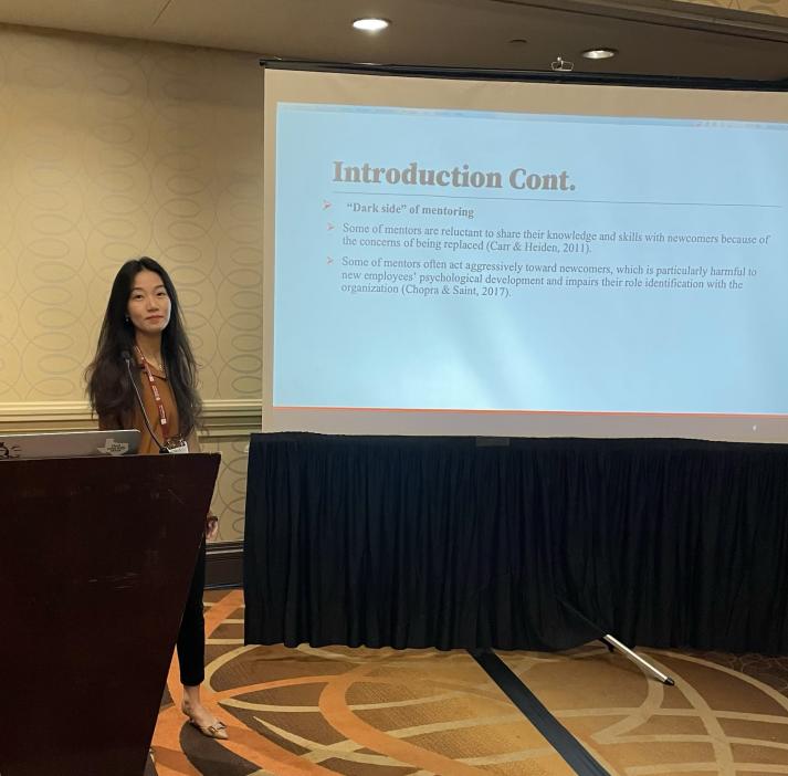 我院教师周小曼博士在“组织行为学——领导力研究”分论坛做了题为“How mentors inspire affective commitment in newcomers: The roles of servant leadership, psychological capital, and feedback seeking behavior”的学术报告。本次报告主要研究探讨了服务型领导和导师的双重角色对酒店新员工情感承诺的多路径影响,并揭示了员工反馈寻求行为对导师的服务型领导与员工心理资本之间关系的调节作用。研究成果为服务业吸引、管理、留任新生代员工,提升其职业承诺,并从组织社会化制度设计视角规避师徒制潜在的“黑暗面”提出管理启示。在通过AOM三位外审专家审稿意见的指导与现场学者的建议下,该论文已投稿至SSCI顶刊。