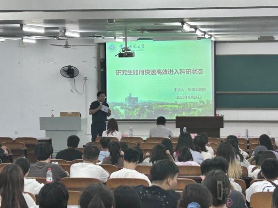 张凤太教授从个人发展历程、学生培养、做好科研的准备工作、学会阅读文献、学会交流与合作、敢于尝试等六个方面进行分享,勉励同学们扎根专业领域,建立学术思维,使用科学的研究方法,积极进行学术研究。另外,张教授鼓励新生做好研究生角色的转换,将“考博”作为研究生生活的目标。