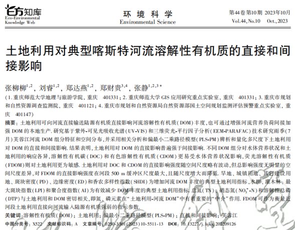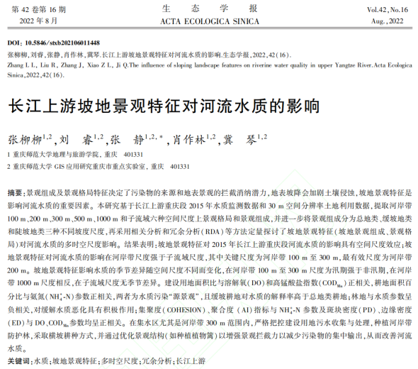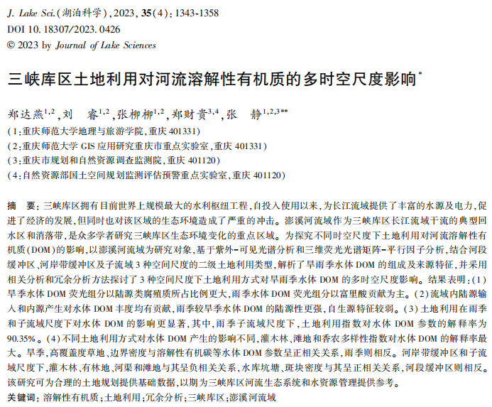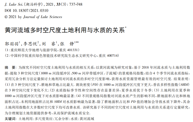 论文主要围绕黄河流域、长江流域、三峡库区等多条干支流的水质问题进行研究,探讨人类活动对河流水质的多时空尺度影响关系。研究结果表明黄河流域范围的人类活动在夏季和河段缓冲区尺度下对水质影响更加显著,长江流域范围内的人类活动在旱季和河岸带缓冲区尺度下对水质影响更大,而三峡库区范围内的人类活动在雨季和子流域尺度下对河流溶解性有机质影响更强。这些结果的不同是由于研究区不同生态背景,不同水文节律,不同耕作方式,以及不同城市化程度导致,研究结果可为黄河流域、长江流域和三峡库区的生态环境保护、河流水质与富营养化管控提供理论依据与数据支撑,具有很强的学术价值与现实意义。