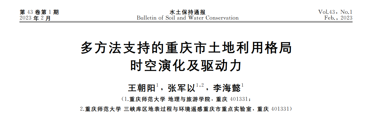 以题为《多方法支持的重庆市土地利用格局时空演化及驱动力》,发表在《水土保持通报》。我院硕士研究生王朝阳为第一作者,张军以教授为通讯作者。论文链接: DOI:10.13961/j.cnki.stbctb.20221207.002.