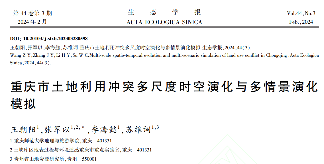 以题为《重庆市土地利用冲突多尺度时空演化与多情景演化模拟》,发表在《生态学报》。我院硕士研究生王朝阳为第一作者,张军以教师为通讯作者。论文链接: https://doi.org/10.20103/j.stxb.202303280598.