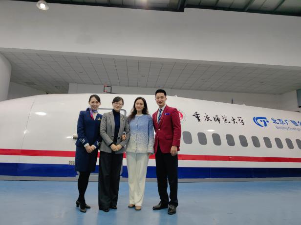 课后两位优秀毕业生在航空服务系谢媛媛主任及北京广慧金通公司驻重师大办事处杨曦主任的带领下参观了航空服务与礼仪实训中心全新升级的双通道模拟舱、航模展示大厅及荣誉墙,回顾了难忘的大学时光。
