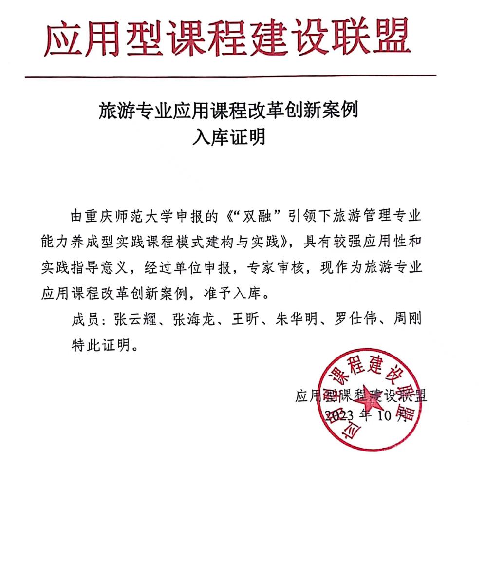 《旅游资源与旅游经营考察实习》课程自我院旅游管理专业设立以来一直开设,目前已经有了28年历程,该课程构建起了“一心双融三元四环五阶 ”的课程建设模式:一心,即以学生专业能力养成为中心;双融,即理论与实践融合、专业与思政融合;三元,即“校园课堂+实践基地+网络平台”三元空间构建;四环,即准备、认知、汇报、评价四个课程环节;五阶,即专业知识提升、调研方法训练、团队意识构建、学习能力提升和专业意识强化五阶段进级人才培养目标。该课程近年来,先后获得重庆市课程思政示范建设项目,该课程团队获得重庆市课程思政教学名师和团队,由该课程总结而来的案例已入选重庆市高校一流课程示范案例,这一次再度入选教育部学校规划建设发展中心应用型课程建设联盟旅游专业应用型课程改革创新案例库。