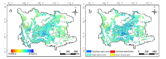 图2 a. 2000-2020年西南喀斯特石漠化年际残差变化趋势 b.石漠化残差的显著变化与石漠化平均变化趋势结果的叠加