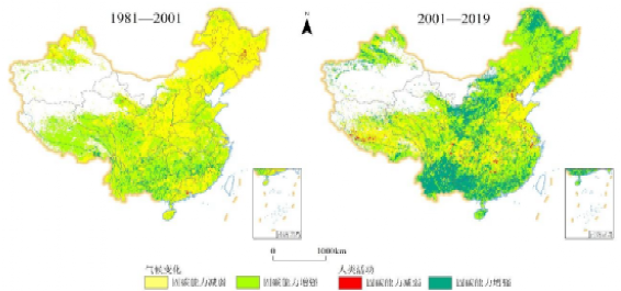1981—2001年期间东北地区受到人类活动干扰明显,导致植被固碳能力下降,主要是由于林地转变为耕地。2001—2019年东北、华北以及中国南部沿海地区人类活动使植被固碳能力明显增强,南部地区主要在于林耕地的转变,北部地区主要在于草耕地的变化。因此,近年来人类活动对陆地植被生态系统的积极干预,有效地改善了土地的生态环境,增加了森林覆盖率,提高了碳汇储量。