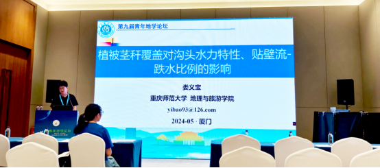 青年教师娄义宝参加了“地表过程与地貌”分会场,做了题为“植被茎秆覆盖对沟头水力特性、贴壁流-跌水比例的影响”的专题报告,分享了自己及团队在植被秸秆处理调节地表侵蚀机制方面的最新研究成果。