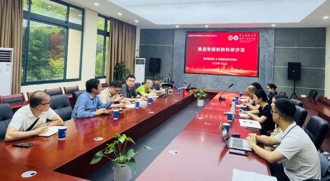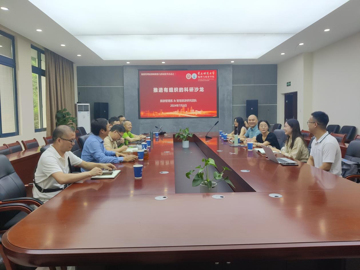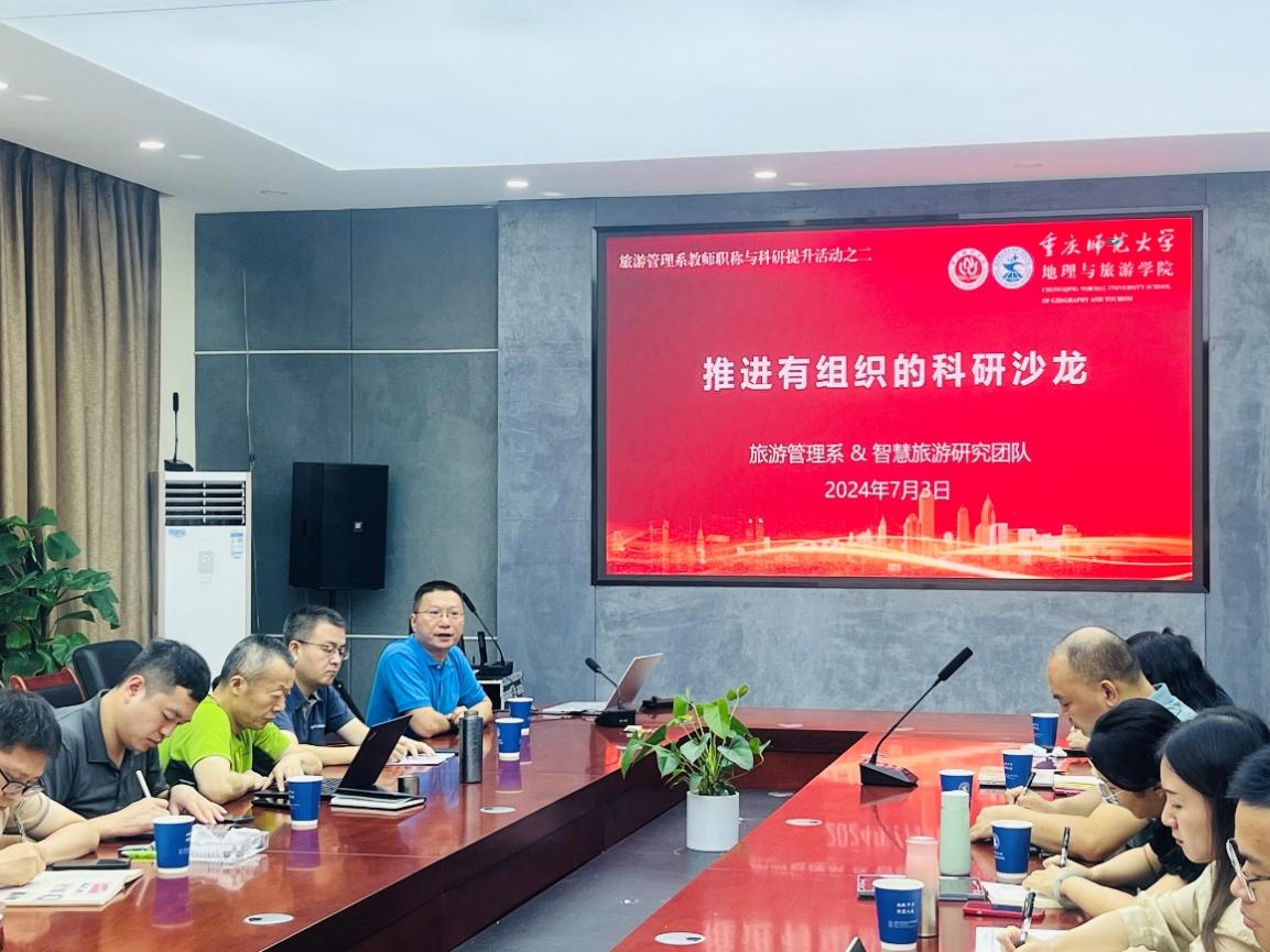 2024年7月3日上午,旅游管理系和智慧旅游研究团队共同组织教师职称与科研提升活动之二:“推进有组织的科研”专题讨论会。讨论会旨在通过讲政策,找差距,定策略,培育新进青年博士和骨干教师的组织意识,团队意识,科研意识,充分发挥旅游管理学科交叉,应用导向,资本密集的突出特色,推动科研产出,提升转化效率。全域智慧旅游重庆市2011协同创新中心主任罗仕伟教授,教务处处长胡志毅教授,职业技术教育(旅游服务)学科带头人胡传东教授,以及旅游管理系和智慧旅游研究团队大部分教师参加了此次讨论会。会议由旅游管理系主任周刚副教授主持。