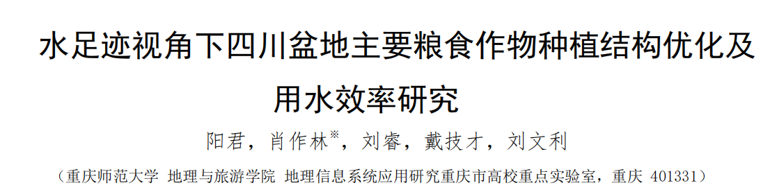 近日,我院地图学与地理信息系统专业研究生阳君基于水足迹理论量化四川盆地3种主要粮食作物用水量,并以此为基础构建蓝水和灰水足迹最小化,经济收益最大化的多目标优化模型,得到不同节水情景(5%、10%和15%)下的最优作物种植结构,最后通过用水效率指数分析优化前后各地农业用水效率。研究成果以“水足迹视角下四川盆地主要粮食作物种植结构优化及用水效率研究”为题发表在《农业工程学报》上。GIS应用创新团队研究生阳君为第一作者,肖作林老师为通讯作者。