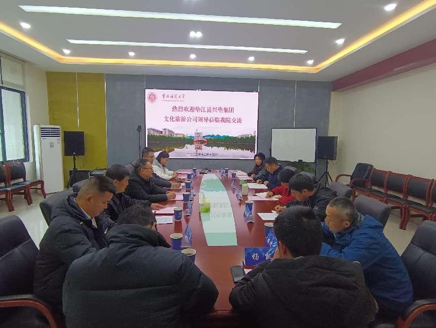 12月15日,重庆垫江县政协委员会原党组副书记、副主席李锦明、重庆兴垫文化旅游开发有限公司董事长王辉、总经理孟凡旭、项目管理部副经理孙敏航、宣传营销部副经理匡红玲、运营管理部副经理郭浩、综合部主管杨凯一行7人到我院进行交流访问,我院党委书记胡芳、副院长(主持工作)韦杰、院长助理、旅游管理系主任张云耀、酒店管理系主任汪琳姝、职业技术教育(旅游服务)研究生领衔导师胡传东和智慧旅游创新团队秘书杨永丰参加了交流会,会议由党委书记胡芳主持。