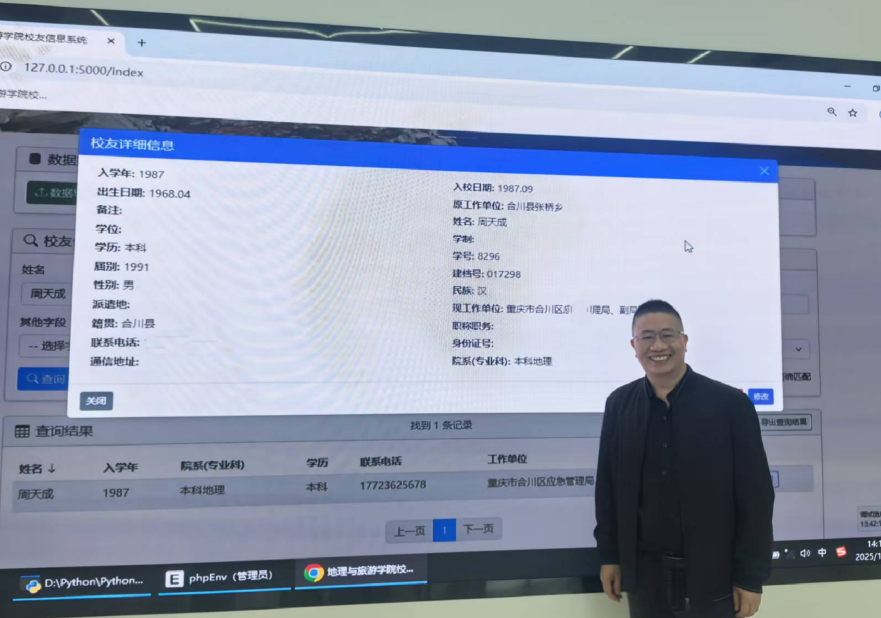 图3.周天成校友在院史文化陈列室高度评价地旅学院“校友信息系统”