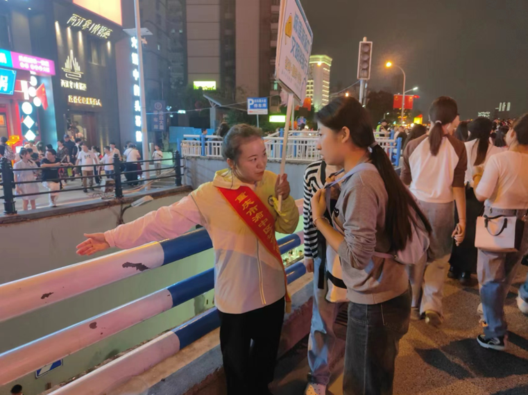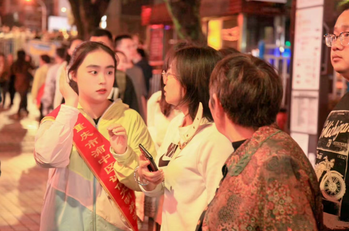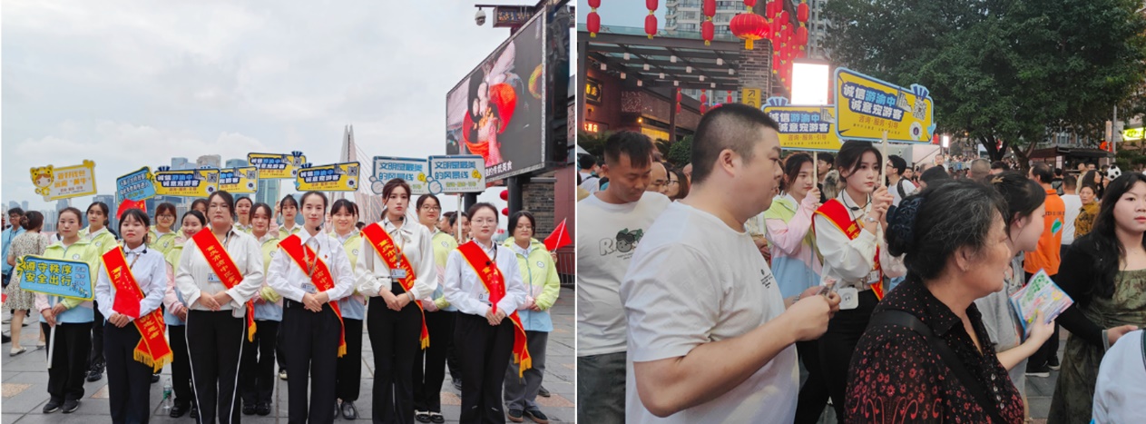 文明旅游志愿者们以定点岗与流动岗相结合的方式开展服务,“双岗结合”,扎实细致周到地执行工作任务,全方位为游客服务,有效宣传渝中文明旅游,根据客流量协调疏导,及时应对现场突发情况。从下午六点到晚十点,志愿者们用敬业、耐心的实际行动向社会传递文明新风,为游客安全出行、文明旅游营造了良好氛围,从而达到促进旅游业发展的目的。同时,志愿者的辛勤工作展现了重师地旅学子吃苦耐劳、团结协作的优良精神风貌。