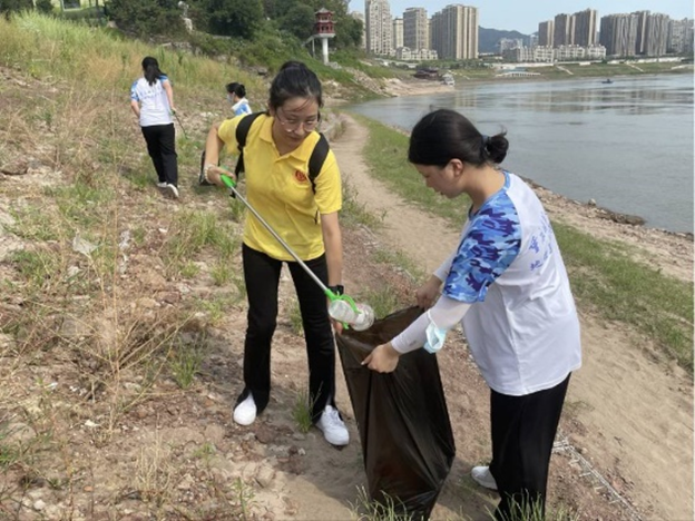 在嘉陵江畔,实践团成员左手拿垃圾袋,右手拿夹钳,顶着烈日清理河道周围以及马路边的塑料瓶、烟头、零食口袋等垃圾,不怕苦也不怕累,为维护古镇美好容貌助力。成员们用实际行动倡导文明行为,响应了习近平总书记所说“绿水青山才是金山银山”的伟大理念。
