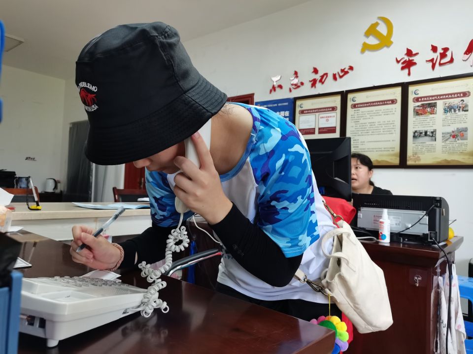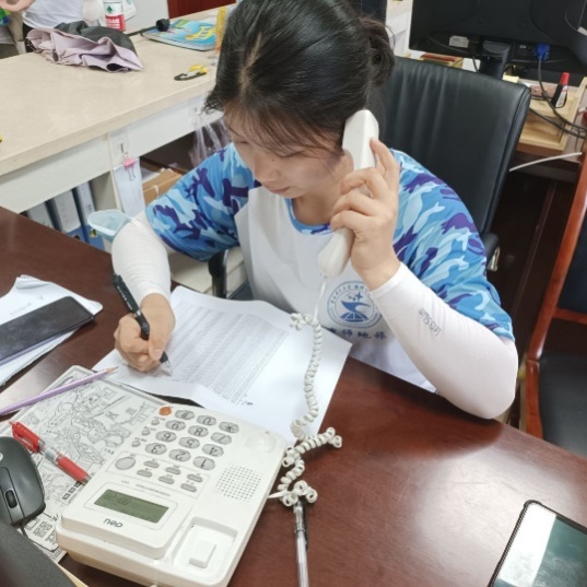 实践队员通过社区办公室电话联系居民统计疫苗接种情况 (周秋云 摄)