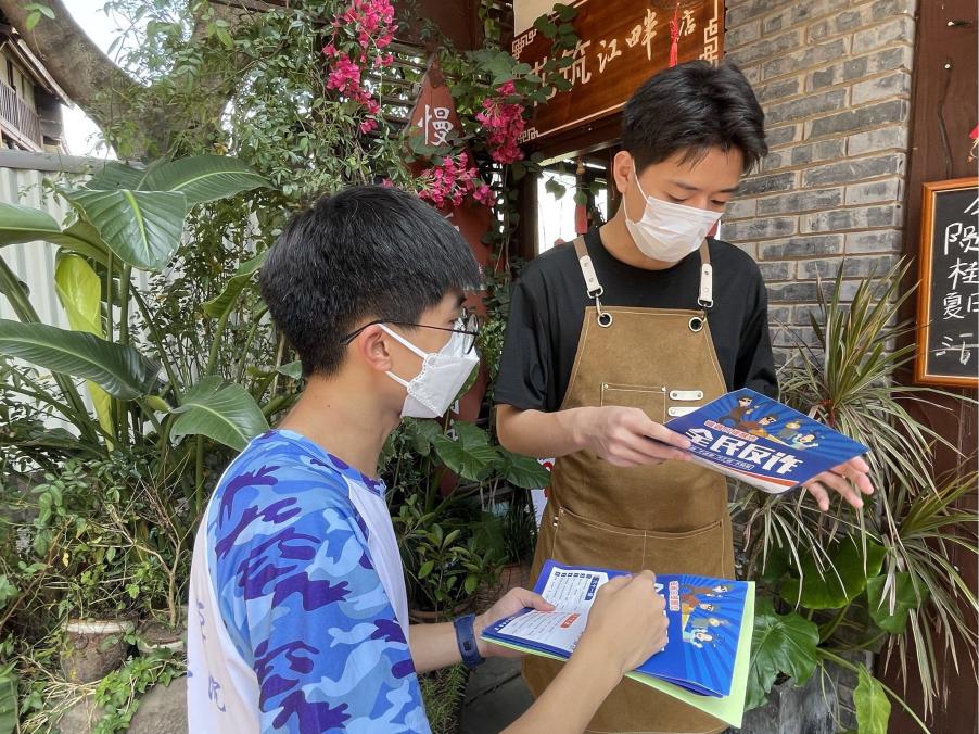 实践队员向沿街商户发放反诈宣传单 (蔡春妍 摄)