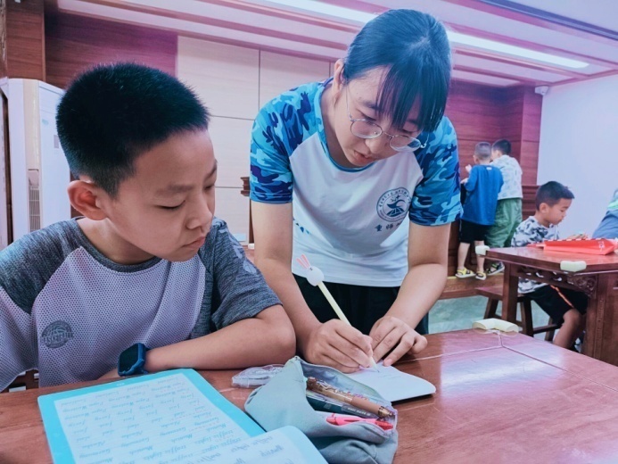回龙坝聚龙城安置房社区属于易地扶贫搬迁安置的典型社区。社区中不止有大量独居老人,忙于工作的子女们还将孙子孙女托于老人照顾。7月14日,实践团针对这种情况特地进行了“聚龙城助教,以育童子之志”的助教活动。实践团成员走进了聚龙城社区的和顺堂——一个专门为小朋友们提供课业辅导与课外活动的场所,更是一个温馨友爱幸福的乐园。服务团成员了解到和顺堂的小朋友们多为社区的小学生,他们上午会在这里完成定量的暑期作业然后阅读书籍。为了更好地协助社区老师的管理,服务团每次指派三名成员到和顺堂为孩子辅导功课,维持秩序。成员员们结合师范专业特长为孩子们细心地讲解数学、语文、英语作业等,陪他们一同破解难题,生动的讲解还吸引了周围其他孩子的注意力,和顺堂的学习氛围更加浓郁。实践团成员耐心细致地纠正孩子们掌握正确的握笔姿势,并调整他们的坐姿,教授课堂基本礼仪,帮助孩子们养成良好的行为习惯和道德品质,鼓励孩子们全面发展,成长为优秀的人。