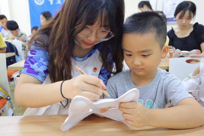 志愿者带领小朋友一起绘制脸谱 (郑瑶 摄)
