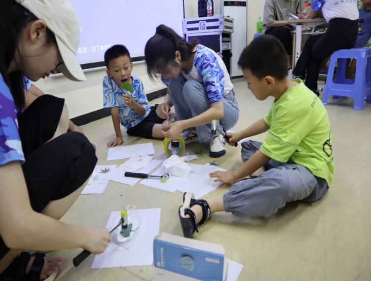 志愿者和小朋友们一起为口罩植物拓染 (王利 摄)
