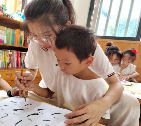 服务团成员手把手指导孩子们书写毛笔字 (刘师赟 摄)
