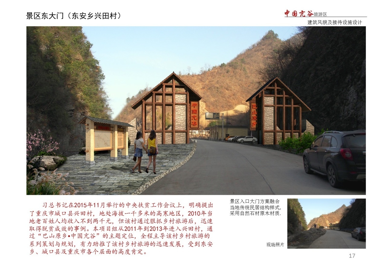 《东安乡兴田村旅游开发策划》《东安乡亢谷景区概念性规划与重点区域修建性详细规划》以及城口县《中国亢谷景区旅游系统设计细案》等系列落地性策划、规划与设计,助推了以兴田村为重点的东安乡乡村旅游的崛起,旅游人次与旅游收入的激增,使兴田村近千户村民迅速走上致富路,东安乡也由贫困乡成为旅游发展重镇,以兴田村为核心的“亢谷”已成为城口县近十年来迅速崛起的最具突破性、引导性与代表性的旅游名片,同时也成为我国秦巴山区的响亮旅游品牌,该成果得到习近平总书记肯定。